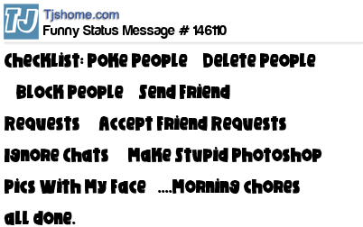 X Checklist: Poke People ✔ Delete People ✔ Block People ✔ Send Friend Requests ✔ Accept Friend Requests ✔ Ignore Chats ✔ Make Stupid Photoshop Pics With My Face ✔....Morning chores all done.