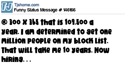 X says @ 300 X 365 that is 109,500 a year. I am determined to get one million people on my block list. That will take me 10 years. Now hiring. . .