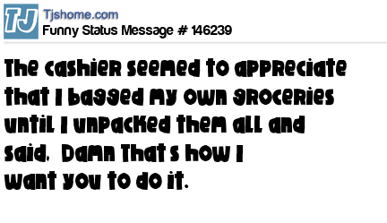X says The cashier seemed to appreciate that I bagged my own groceries until I unpacked them all and said, “Damn That’s how I want you to do it.”
