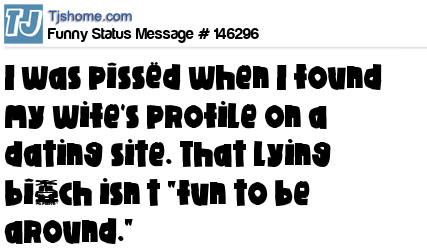 - # 103941 I was so angry when I found my wife's profile on a dating website. That lying b!tch isn't “fun to be around.”