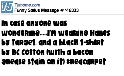 X says In case anyone was wondering.....I'm wearing Hanes by Target, and a black t-shirt by BC Cotton (with a bacon grease stain on it) #redcarpet