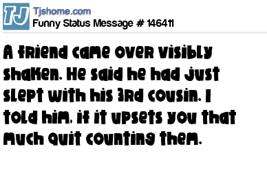- # 202888 My neighbor man came over visibly shaken. He said he had just slept with his 3rd cousin. I told him, if it upsets you that much quit counting them.