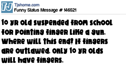 X 10 yr old suspended from school for pointing finger like a gun. Where will this end? If fingers are outlawed, only 10 yr olds will have fingers.