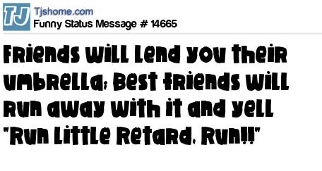 X  Friends will lend you their umbrella; Best friends will run away with it and yell "Run little Retard, Run!!"