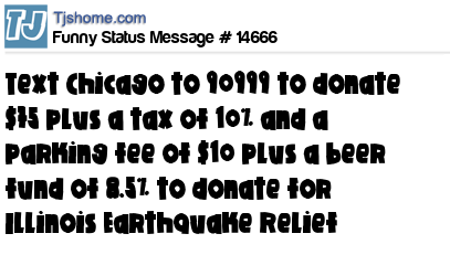 X is Text Chicago to 90999 to donate $75 plus a tax of 10% and a parking fee of $10 plus a beer fund of 8.5% to donate for Illinois Earthquake Relief