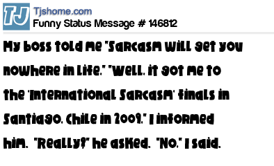 X says My boss told me "Sarcasm will get you nowhere in life," "Well, it got me to the 'International Sarcasm' finals in Santiago, Chile in 2009," I informed him. "Really?" he asked. "No," I said.