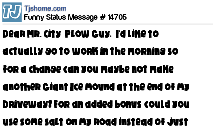 X Dear Mr. City Plow Guy, I'd like to actually go to work in the morning so for a change can you maybe not make another Giant Ice mound at the end of my Driveway? For an added bonus could you use some salt on my road instead of just flatting out the snow.