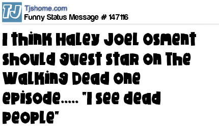 X says I think Haley Joel Osment should guest star on The Walking Dead one episode..... "I see dead people"