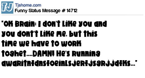 X says "Ok Brain: I don't like you and you dont't like me, but this time we have to work toghet....DAMN! He's running awaritnfdnsfoeinlsjerfjsgrjjdfks..."