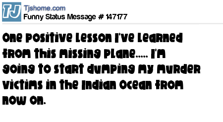 X says One positive lesson I've learned from this missing plane..... I'm going to start dumping my murder victims in the Indian Ocean from now on.