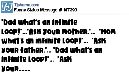 X "Dad what's an infinite loop?"..."Ask your mother."... "Mom what's an infinite loop?"... "Ask your father."... "Dad what's an infinite loop?"... "Ask your........