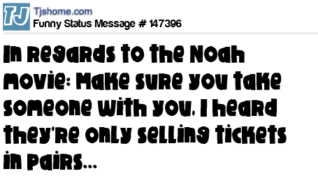 X says In regards to the Noah movie: Make sure you take someone with you, I heard they're only selling tickets in pairs...