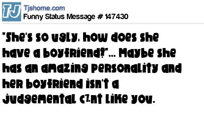 X says "She's so ugly, how does she have a boyfriend?"... Maybe she has an amazing personality and her boyfriend isn't a judgemental c%nt like you.