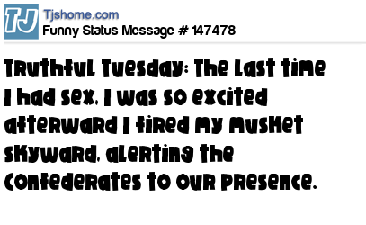 X says Truthful Tuesday: The last time I had sex, I was so excited afterward I fired my musket skyward, alerting the Confederates to our presence.