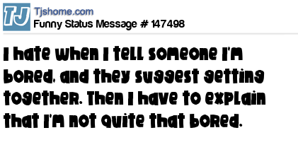 X I hate when I tell someone I'm bored, and they suggest getting together. Then I have to explain that I'm not quite that bored.