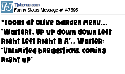 X *Looks at Olive Garden menu.... "Waiter?,, Up up down down left right left right B A"... Waiter: "Unlimited breadsticks, coming right up"