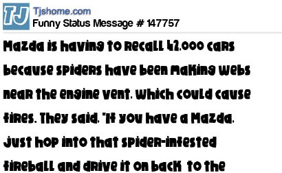 X says Mazda is having to recall 42,000 cars because spiders have been making webs near the engine vent, which could cause fires. They said, "If you have a Mazda, just hop into that spider-infested fireball and drive it on back to the dealership."
