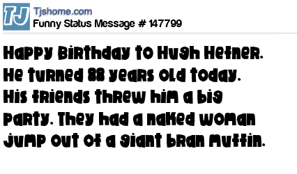 X says Happy Birthday to Hugh Hefner. He turned 88 years old today. His friends threw him a big party. They had a naked woman jump out of a giant bran muffin.
