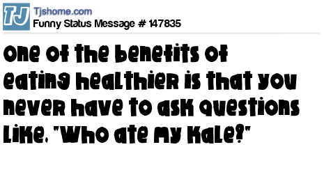 X says One of the benefits of eating healthier is that you never have to ask questions like, "Who ate my kale?"