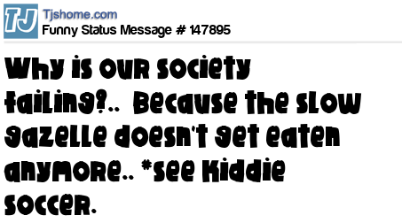 X Why is our society failing?.. Because the slow gazelle doesn't get eaten anymore.. *see kiddie soccer.