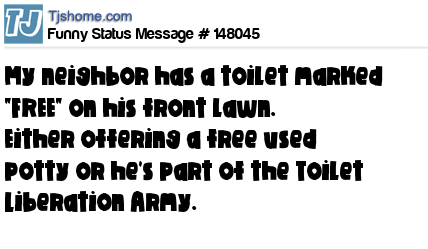 X says My neighbor has a toilet marked "FREE" on his front lawn.  Either offering a free used potty or he's part of the Toilet Liberation Army.
