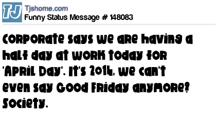 X says Corporate says we are having a half day at work today for 'April Day'. It's 2014, we can't even say Good Friday anymore? Society.