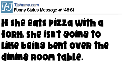 X says If she eats pizza with a fork, she isn't going to like being bent over the dining room table.