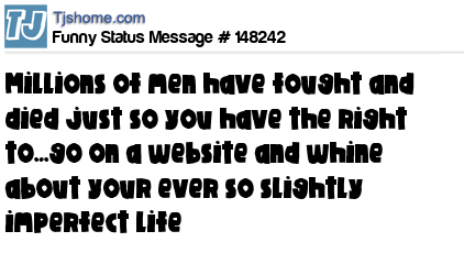 - # 148077 Millions of men have fought and died just so you have the right to go on a website and whine about your ever so slightly imperfect life