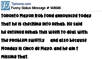 X says Toronto Mayor Rob Ford announced today that he is checking into rehab. He said he entered rehab this week to deal with the problem swiftly — and also because Monday is Cinco de Mayo, and he ain’t missing that.