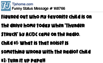 X Figured out who my favorite child is on the drive home today when "Thunder Struck" by AC/DC came on the radio. Child #1: What is that noise? Is something wrong with the radio? Child #2: Turn it up papa!!