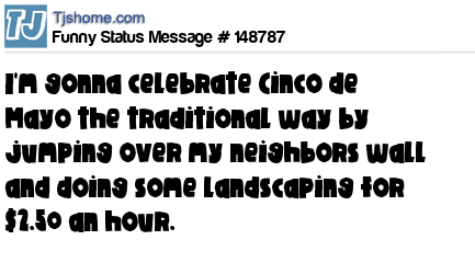 X says I'm gonna celebrate Cinco de Mayo the traditional way by jumping over my neighbors wall and doing some landscaping for $2.50 an hour.