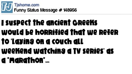 X says I suspect the ancient Greeks would be horrified that we refer to 'laying on a couch all weekend watching a TV series' as a "marathon"…