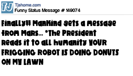 X Finally!! Mankind gets a message from Mars... *The President reads it to all humanity YOUR FRIGGING ROBOT IS DOING DONUTS ON MY LAWN