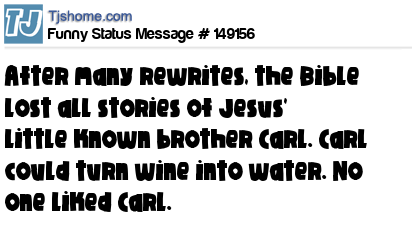 X says After many rewrites, the Bible lost all stories of Jesus' little known brother Carl. Carl could turn wine into water. No one liked Carl.