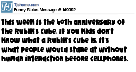 X says This week is the 40th anniversary of the Rubik's Cube. If you kids don't know what a Rubik's Cube is, it's what people would stare at without human interaction before cellphones.