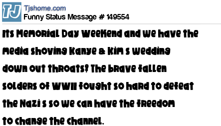 - # 149537 Its Memorial Day Weekend and we have the media shoving Kanye & Kim’s wedding down out throats? I doubt this is what our fallen solders of WWII fought so bravely to defeat the Nazi’s. On behalf of them I am sorry.