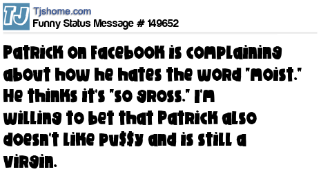 X says Patrick on Facebook is complaining about how he hates the word "moist." He thinks it's "so gross." I'm willing to bet that Patrick also doesn't like pu$$y and is still a virgin.