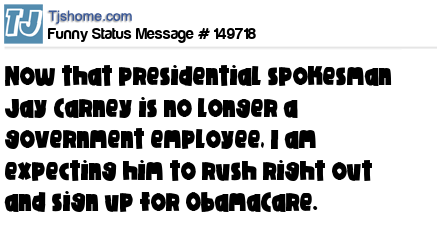 X Now that presidential spokesman Jay Carney is no longer a government employee, I am expecting him to rush right out and sign up for ObamaCare.