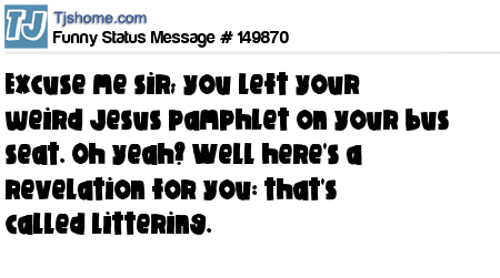 X says Excuse me sir; you left your weird Jesus pamphlet on your bus seat. Oh yeah? Well here's a revelation for you: that's called littering.