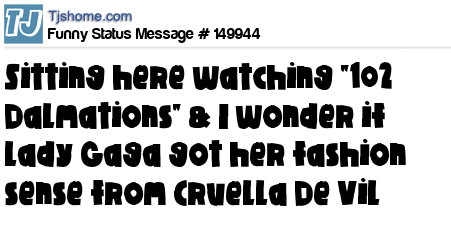 X says sitting here watching "102 Dalmations" & I wonder if Lady Gaga got her fashion sense from Cruella De Vil