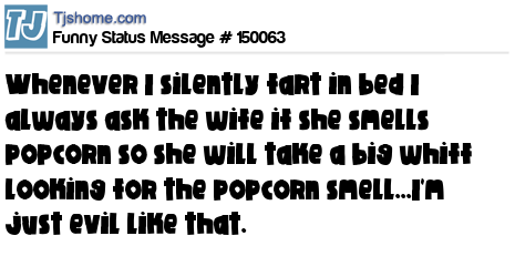 - # 189028 In a crowded room I like to let out a silent but deadly fart then shout "do I smell popcorn" so everyone gets a good whiff!