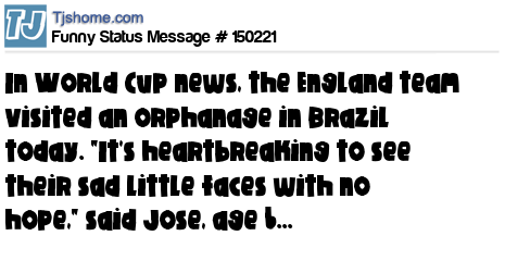 X In World Cup news, the England team visited an orphanage in Brazil today. "It's heartbreaking to see their sad little faces with no hope," said Jose, age 6...