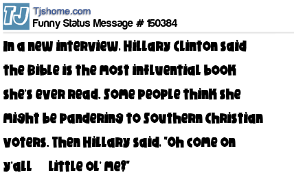 X says In a new interview, Hillary Clinton said the Bible is the most influential book she's ever read. Some people think she might be pandering to Southern Christian voters. Then Hillary said, "Oh come on y'all — little ol' me?"