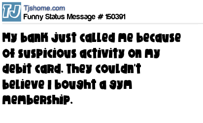 X says My bank just called me because of suspicious activity on my debit card. They couldn't believe I bought a gym membership.