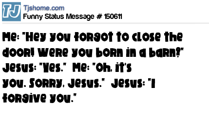 X says Me: "Hey you forgot to close the door! Were you born in a barn?" Jesus: "Yes." Me: "Oh, it's you. Sorry, Jesus." Jesus: "I forgive you."