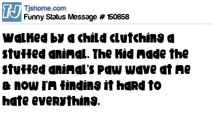 - # 150834 Posted 14 hours ago Walked by a child clutching a stuffed animal. The kid made the stuffed animal's paw wave at me & now I'm finding it hard to hate everything.