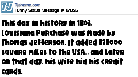 X This day in history in 1803. Louisiana Purchase was made by Thomas Jefferson. It added 828000 square miles to the USA,,, and later on that day, his wife hid his credit cards.