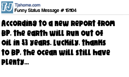 X says According to a new report from BP, the earth will run out of oil in 53 years. Luckily, thanks to BP, the ocean will still have plenty...