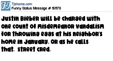 - # 144002 Bieber's arrest doesn't give him street cred, it actually just raises the street cred bar a little higher...