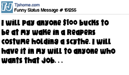 X says I will pay anyone $100 bucks to be at my wake in a Reapers costume holding a scythe. I will have it in my will to anyone who wants that job. . .